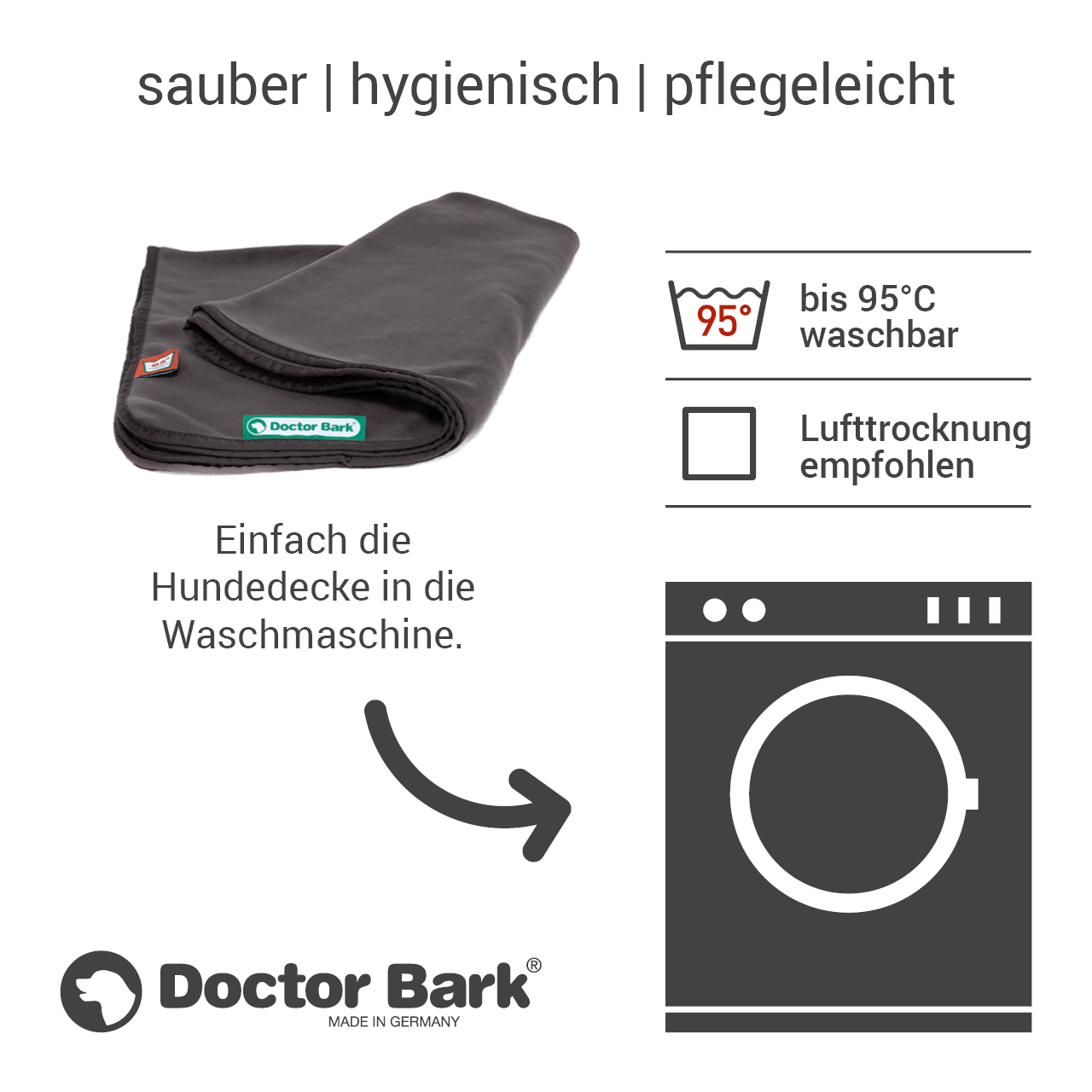 Alle Doctor Bark Hundedecken werden im GANZEN bei 95˚C gewaschen, nicht nur der Überzug,